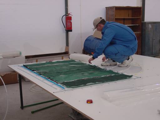 First of all, the carbon should be very well impregnated with epoxy using the CVI process. It worked out very well; if that would not have been the case, we should have found another solution, like modifying the lay-up of the reinforcement, using another flow-medium (maybe two-sided) etc. Recording the position of the front as a function of time, together with the resin viscosity provides sufficient information to run the simulation. Using the results from infusion of the actual laminates used in the final product is most accurate. The tests also allow us to show the basics of the CVI process: handling the materials, dry lay-up of reinforcement, peelply and flow medium, application and sealing of the bag. PhotographsUse the controls below the image to view the photographs. In addition to a test of four different laminates (the first one is the thickest laminate with flow medium and peelply on both sides, the last one is peelply and flow medium only without any carbon), we did a test of the thickest laminate on a glass plate. At the backside, you can see the difference of the resin front position in the carbon compared to the visual front in the flow medium. The last picture shows a test of alternative materials for use as a flow medium.