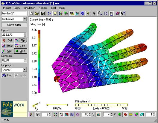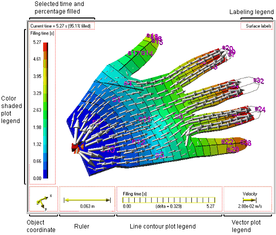 The largest part of the screen is used to display the model. It also includes object coordinate axes to indicate the orientation of the model and a ruler that measures the scale. The ruler size is averaged if perspective projection is used. Current time and percentage filled are shown in the upper left corner when results are available from a simulation. Legends are added where applicable for shaded color plots, line contour plots, vector plots and labels respectively.
