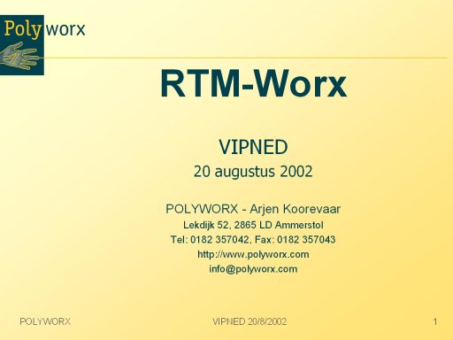 Deze presentatie is gegeven door Arjen Koorevaar op de plenaire VIPNED bijeenkomst, 20 augustus 2002 bij de TU Delft; Faculteit Lucht en Ruimtevaart. VoorbeeldenOm de toepassing van de RTM-Worx simulatie software te illustreren zijn verschillende voorbeelden getoond tijdens de presentatie. Klik voor foto's en animaties van de simulaties van deze projecten op onderstaande links.